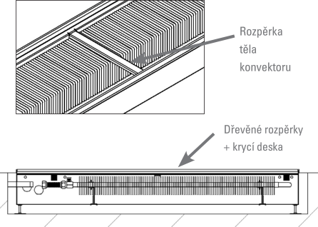 Podlaha musí lícovat co nejpřesněji s obvodem konvektoru. Dilatační spáru je třeba vyplnit např. korkovým obložením nebo silikonem. Tím se zabrání horizontálnímu pohybu konvektoru při zatěžování.