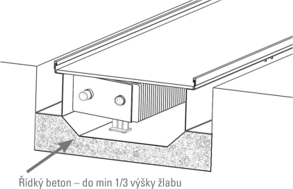 V případě instalace do lité podlahy před betonáží řádně utěsněte (lepicí páskou) všechny netěsnosti (např. nepoužité předvyražené připojovací otvory a montážní rozpěrky) tak, aby nemohlo dojít k vniknutí betonové směsi do vany konvektoru. Při betonáži musí být konvektor zafixován do podlahy pomocí kotvících šroubů, které zabrání vertikálnímu posunu konvektoru při následném zalití betonem nebo jiným vhodným materiálem. Při zalévání betonem je možné rovněž konvektor svisle zatížit.