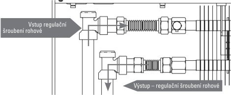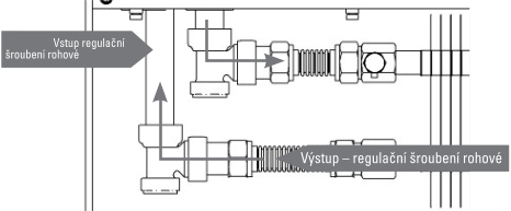 Výstup (zpátečka): na zpátečku se připojuje vždy regulační šroubení. V případě potřeby může být přívod a odvod otopné vody do výměníku zaměněn v závislosti na prostoru potřebného pro termostatickou hlavici, ale armatury se montují vždy tak, jak je uvedeno výše.